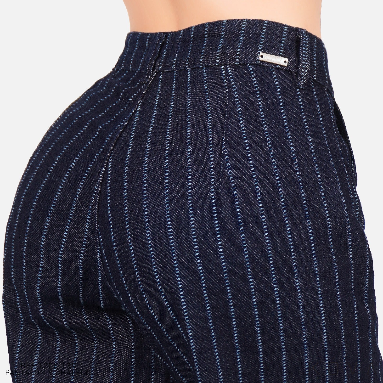 Pantalón tiro alto en denim rígido de tacto suave, con silueta recta que estiliza la figura y brinda una estructura firme sin perder comodidad. ideal para outfits casuales y urbanos.